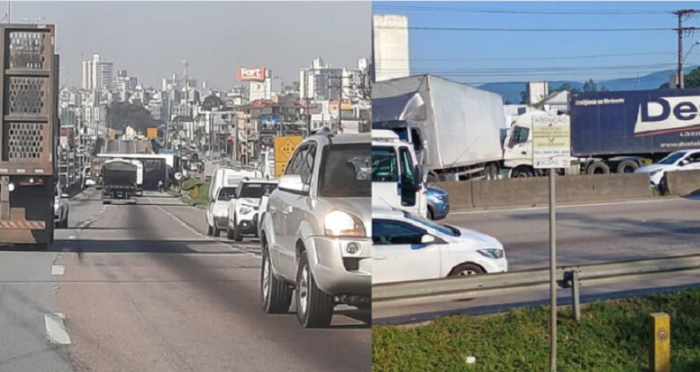 O tráfego é desviado pela via marginal - Foto: Reprodução Um acidente envolvendo dois caminhões deixou o km 202 da BR-101, em São José, interditada no sentido Sul, em direção a Porto Alegre, na manhã desta terça-feira, 23 de julho.