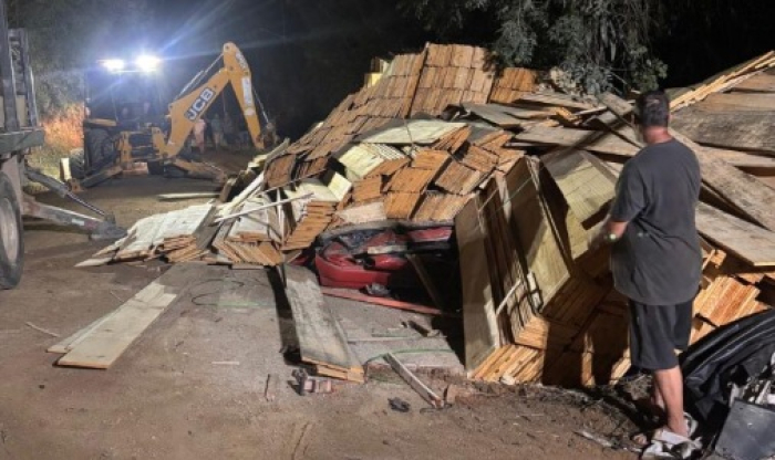 Grande quantidade de madeira que caiu sobre o automóvel exigiu o uso de maquinário pesado para a remoção - Foto: Divulgação Um grave acidente de trânsito causou a morte de duas pessoas no fim da tarde do último domingo, 22 de março, na SC-435, no Bairro Santa Maria, em São Bonifácio.