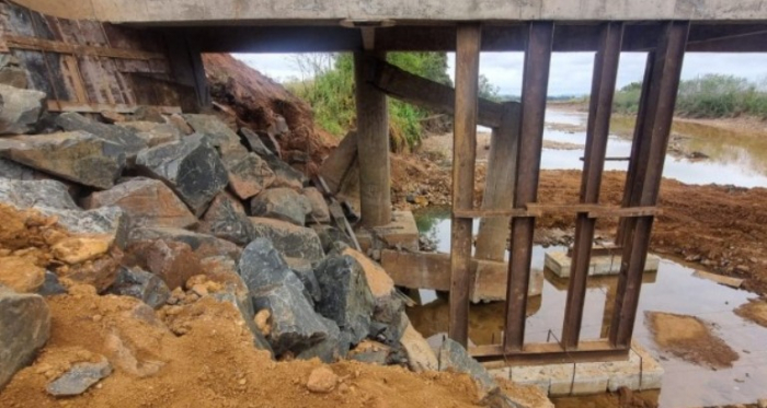 Agora as obras terão caráter definitivo. O pilar cedeu em função de fortes chuvas que atingiram a região em meados de junho deste ano, elevando muito o nível do rio e o volume de água que passava sob a estrutura.