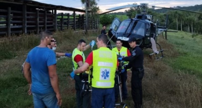 Devido à gravidade da situação, a equipe mobilizou a vítima e a transportou até um local seguro, de onde acionou o helicóptero do Serviço Aeropolicial (Saer)/Serviço de Atendimento e Resgate Aeromédico do Sul (Sarasul).