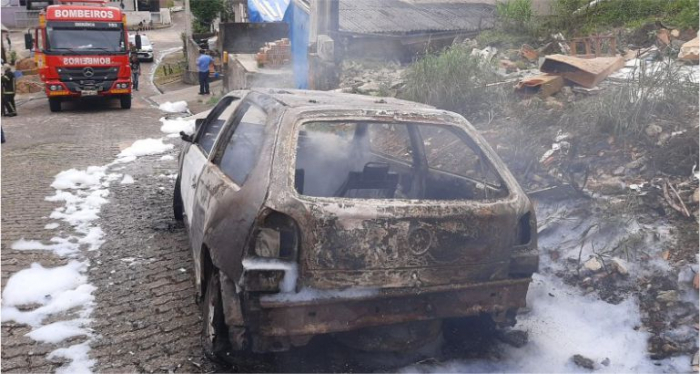 Felizmente ninguém se feriu na ocorrência - Foto: Divulgação/Corpo de Bombeiros Por volta das 12h15 deste sábado, 21 de outubro, um Volkswagen Gol foi destruído por um incêndio na Rua São Paulo, no Bairro Alto Paraná, em Orleans. Moradores locais relataram que um homem ateou fogo no veículo e fugiu, de acordo com o Corpo de Bombeiros.