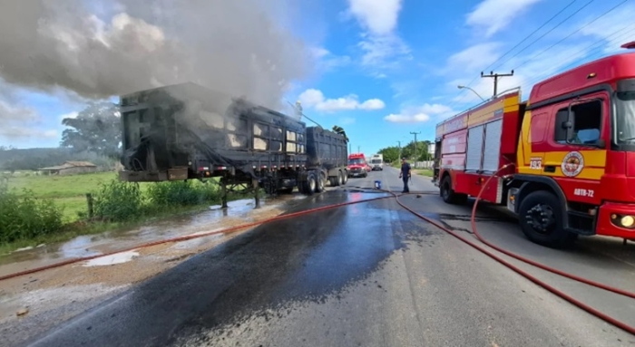 Foram utilizados cerca de 20 mil litros de água - Foto: Divulgação Uma carreta bitrem carregada com rejeitos industriais inflamáveis pegou fogo na tarde de sexta-feira, 31 de janeiro, em Morro da Fumaça.
