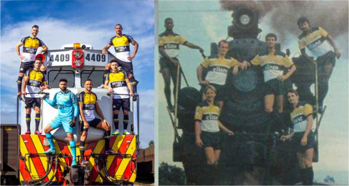 Reprodução foi realizada no último mês de junho - Foto: Perraro No mês de junho, a Ferrovia Tereza Cristina recebeu a visita dos atletas e da equipe de marketing do Criciúma Esporte Clube para recriar uma foto produzida na década de 80. Na primeira foto, os jogadores da temporada 2023, estão em uma locomotiva modelo GM G22 CU, que compõe, atualmente, a frota da FTC.