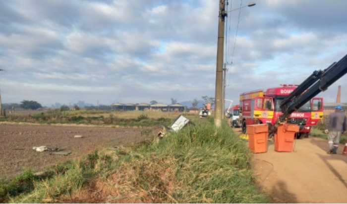 O Corpo de Bombeiros foi acionado e verificou que havia ocorrido uma saída de pista seguida de capotamento do veículo Renaut Sandero.