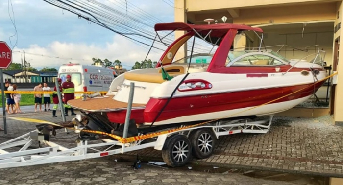 Apesar do impacto, não houve registro de feridos - Foto: Divulgação Uma lancha, colidiu contra a parede de vidro de uma empresa de comércio automotivo em Araranguá. A embarcação se desacoplou do engate e saiu da pista quando bateu contra o estabelecimento.