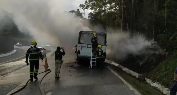 As causas do incêndio não foram reveladas e deverão ser apontadas após realização de perícia - Foto: Divulgação Um micro-ônibus do tipo motorhome pegou fogo quando seguia pela BR-282, em direção à Serra catarinense, na tarde da última sexta-feira, 01 de novembro.