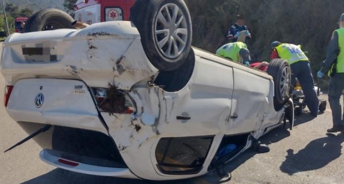 Ela estava consciente e sofreu escoriações nas pernas - Foto: Divulgação Uma motorista capotou o carro após tentar matar uma aranha em Orleans. Ela dirigia um Gol na rodovia SC-390 quando perdeu o controle da direção, bateu contra um barranco e em seguida o carro tombou sobre a pista na manhã desta quinta-feira, 17 de agosto, no Bairro Santa Clara.