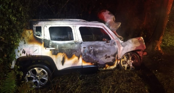 1,5 mil litros de água para combater as chamas e realizar o rescaldo - Foto: Divulgação Uma motorista foi retirada de um veículo Jeep Renegade em chamas, após perder o controle da direção, sair da pista e colidir o automóvel contra uma árvore, na avenida Aristides Bolan, no bairro Mina Brasil, em Criciúma. O acidente de trânsito foi registrado na noite do último sábado, 20 de abril.