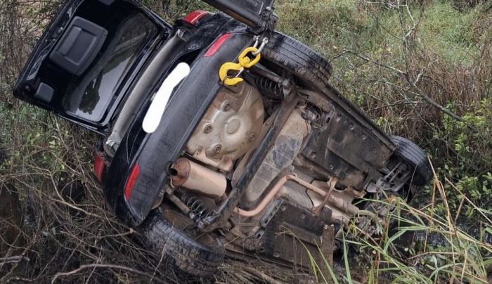 A motorista, de 38 anos, foi resgatada pelo Corpo de Bombeiros sem ferimentos graves - Foto: Divulgação Um veículo saiu da pista, tombou e ficou preso em uma árvore na Rodovia Sebastião Leandro, em Maracajá. O acidente aconteceu na manhã desta segunda-feira, 04 de agosto, no bairro Sangão Madalena.
