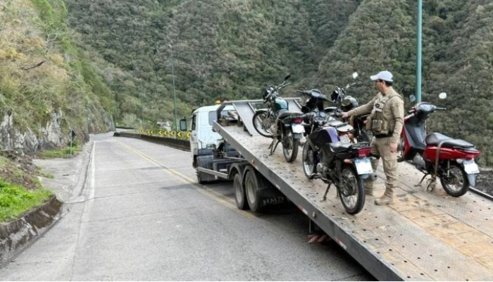 Um guincho foi acionado e levou os veículos até o pátio conveniado - Foto: Divulgação A Polícia Militar Rodoviária (PMRv) apreendeu cinco motocicletas no final da tarde do último domingo, 31 de agosto, na Serra do Rio do Rastro (SC-390), em Lauro Müller.