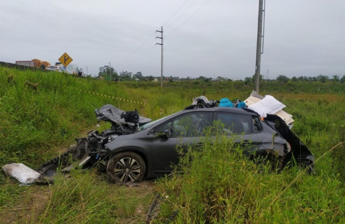 O acidente ocorreu no KM 450 da BR-101, na pista sentido Sul, por volta das 6h45. Chovia forte no momento.Segundo informações da CCR ViaCosteira, o Peugeot 2008, após capotar, parou em uma área de mata.