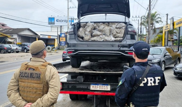 Após o acompanhamento, o veículo foi abordado e, na busca veicular, os policiais apreenderam cerca de 47 kg de skunk já embalados. Dois homens foram presos na ação.