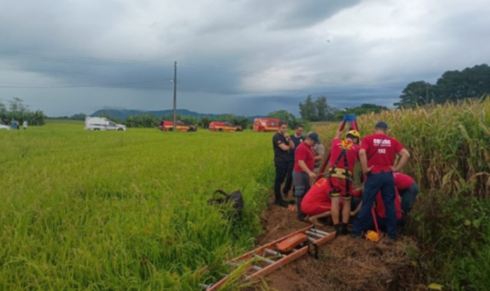 Nove Bombeiros atuaram na ocorrência e localizaram as vítimas que haviam sido arrastadas por um dreno - Foto: Divulgação Um tio e um sobrinho, de 14 anos, não sobreviveram após serem puxados por dreno em um rio em Forquilhinha.