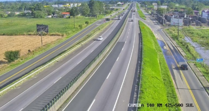 No sentido Norte, há ainda dois trechos com bloqueios. No km 403, no limite entre Araranguá e Maracajá, a pista expressa está totalmente interditada devido a um alagamento da pista.