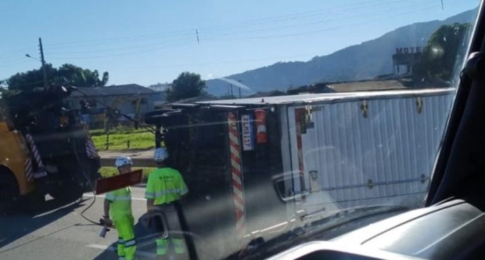 Equipes atuam no atendimento da ocorrência, na estabilização do veículo e da carga. Ainda não há previsão para a liberação total da via, que depende da remoção do caminhão e da limpeza da pista.
