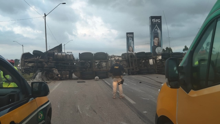Veículos leves conseguem desviar por uma estrada lateral - Foto: Divulgação A BR-101 no km 158 sentido sul, em Itapema, segue interrompida por tombamento de carreta com cimento. O acidente não deixou vítimas, apenas danos materiais.