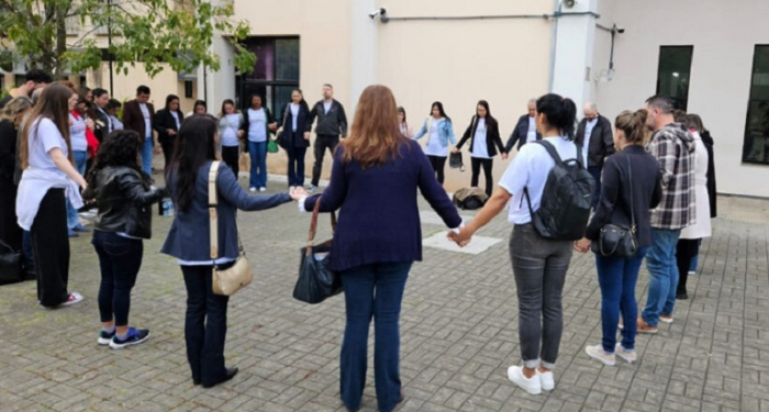 Familiares fizeram oração antes de entrar na sala do tribunal do júri - Foto: Bianca Bertoli O assassino do ataque a creche de Blumenau foi condenado a 220 anos de prisão. A sentença foi lida nesta quinta-feira (29), após mais de 10 horas de julgamento, que começou pouco antes das 9h.