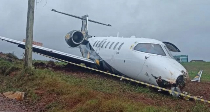 Avião após saída de pista em Erechim - Foto: Corpo de Bombeiros de Erechim Na tarde desta terça-feira, 23 de abril, por volta das 13h50, um avião da farmacêutica Cimed saiu da pista após pousar em Erechim, no Rio Grande do Sul.
