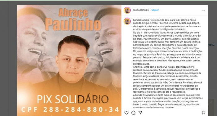 Pix solidário em prol da recuperação de Paulinho Dill - Foto: Reprodução Após sofrer um grave acidente de trânsito no dia 11 de novembro, o vocalista da banda Os Atuais, Paulinho Dill, de 37 anos, está em processo de recuperação.
