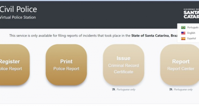 Já o registro de Boletins de Ocorrências por estrangeiros via portal foi solicitado pela PCSC e tornado acessível graças à integração realizada pelo Ciasc no sistema da Delegacia Virtual. A nova versão da Delegacia Virtual que possibilita o registro de Boletins de Ocorrência por estrangeiros passou a oferecer instruções e interface nos idiomas espanhol e inglês.