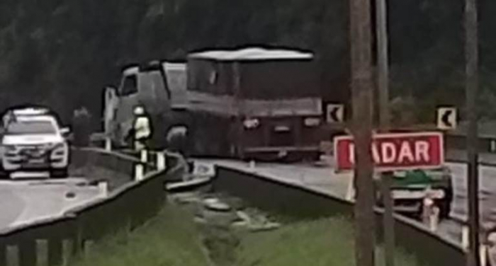 Guincho da concessionária Arteris está removendo o veículo e limpando a pista - Foto: Reprodução Na tarde desta quarta-feira, 09 de agosto, aproximadamente às 14h uma carreta fez um “L” e interditou parcialmente uma das faixas em ambos os sentidos da BR-101 em Palhoça, região do Morro dos Cavalos, no sentido Norte.