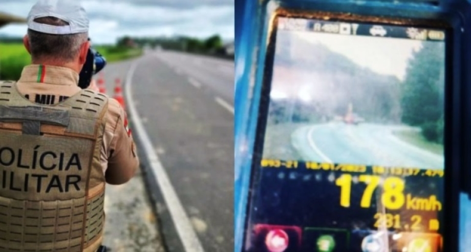 Foto: Divulgação/PMRv Um carro de luxo foi flagrado transitando a quase 180 km/h na SC-415, em Balneário Barra do Sul, no Litoral Norte de Santa Catarina. A velocidade é mais que o dobro da permitida no local.