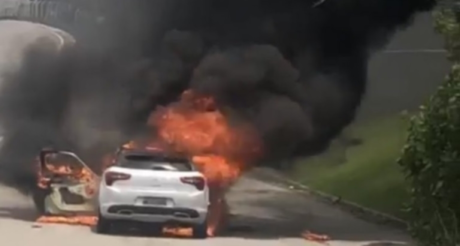 Faixa da direita está bloqueada por conta do Citroen/DS5 que foi tomado pelas chamas. Apesar disso, ele afirma que a ocorrência não deixou vítimas.