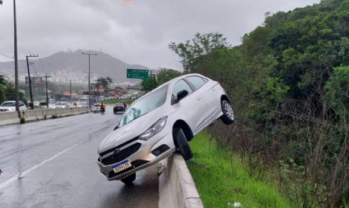 Remoção do veículo é realizada com um guincho - Foto: Divulgação Um carro rodou na pista, no sentido Centro de Florianópolis, na rodovia SC-401, e ficou preso na mureta de proteção na manhã desta segunda-feira, 04 de novembro.