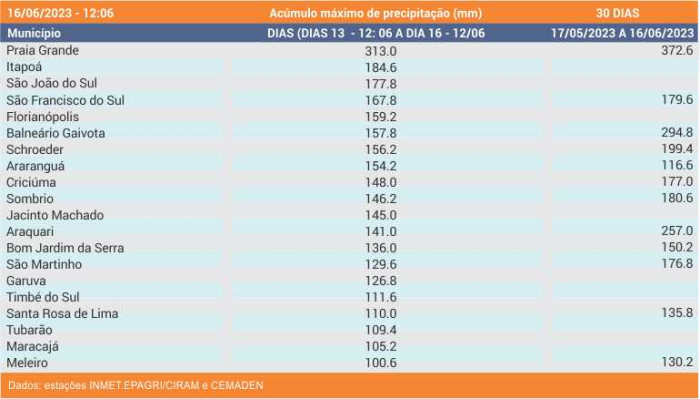 Conforme dados da Epagri/Ciram, de quarta, 13 e sexta-16, somente em Praia Grande choveu mais de 300 mm