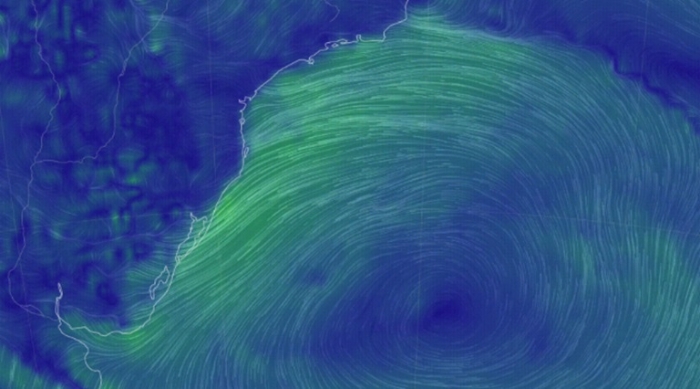 Imagem do modelo de ventos próximos à superfície - Foto: Divulgação A chuva que atinge o litoral catarinense desde a manhã da última quinta-feira, 16 de janeiro, tem sido intensa, com acumulados significativos de precipitação. Cidades como Tijucas registraram 280mm, Camboriú 176mm, e Florianópolis 153mm, números que já representam até 70% da chuva esperada para todo o mês de janeiro.