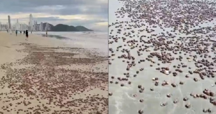O registro foi feito na altura da Rua 2500 - Foto: Divulgação Um vídeo flagrou centenas de conchas do molusco berbigão cobrirem parte na faixa de areia da Praia Central de Balneário Camboriú, no Litoral Norte de Santa Catarina.