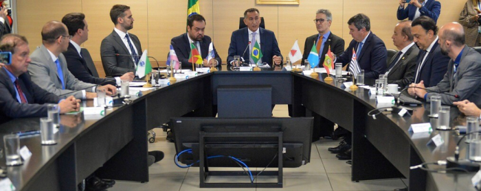 Dois secretários do estado também participaram da reunião - Foto: Eduardo Valente Em reunião realizada nesta terça-feira, 04 de julho, no Ministério da Integração e Desenvolvimento Regional (MIDR), em Brasília, o governador Jorginho Mello e os governadores que integram o Consórcio de Integração Sul e Sudeste (Cosud) e o Conselho de Desenvolvimento e Integração Sul (Codesul), discutiram com o ministro Waldez Góes as prioridades para Santa Catarina e os temas de relevância para as demais regiões.
