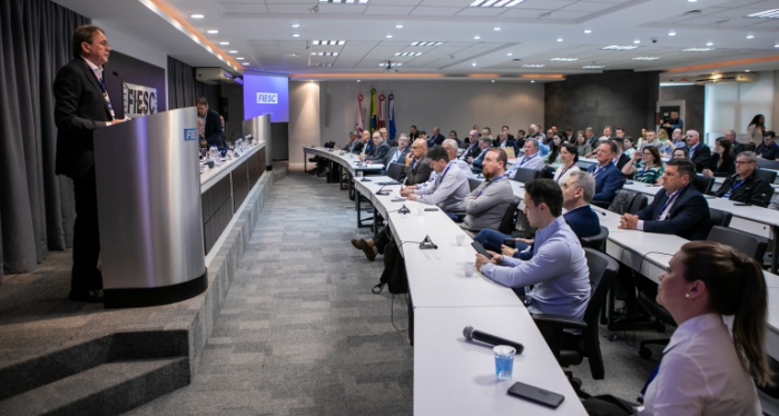 Aguiar citou o caso da proposta de mudança da jornada de trabalho - Foto: Filipe Scotti Em encontro no qual a Federação das Indústrias de Santa Catarina (Fiesc) ouviu sindicatos filiados a respeito das estratégias de defesa do setor, o presidente Mario Cezar de Aguiar destacou a importância do posicionamento firme das entidades representativas diante dos problemas que afetam o segmento fabril.