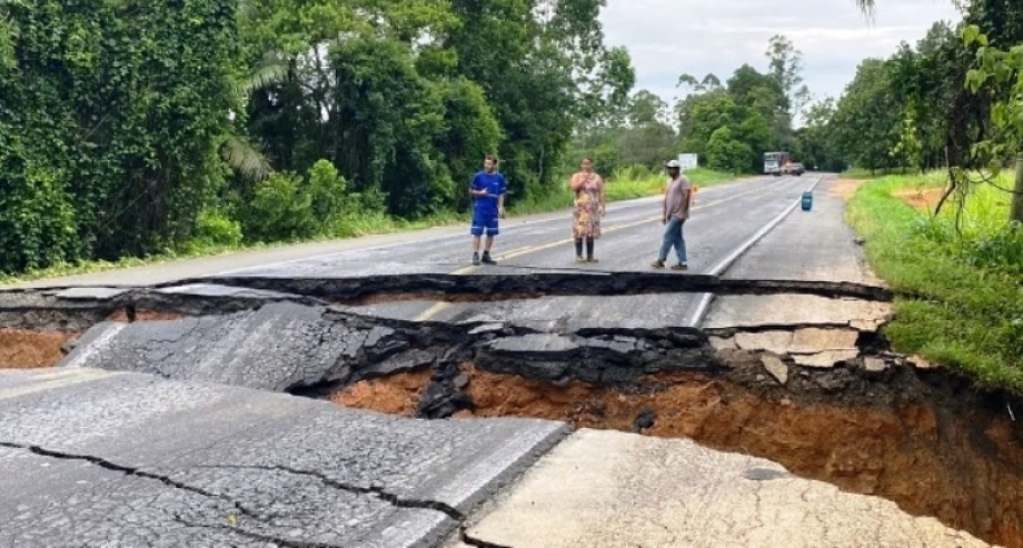 O temporal, que afetou outros municípios do estado, também abriu uma cratera na BR-470 em Indaial, no Vale do Itajaí. O km 75,8 da rodovia foi totalmente bloqueado na madrugada desta quarta-feira, 18.