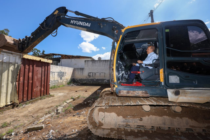 A intenção do governo é que o espaço seja destinado a parceiras com a iniciativa privada - Foto: Leo Munhoz No comando de uma escavadeira, o governador Jorginho Mello deu início simbólico à demolição do Complexo Penitenciário da Agronômica, em Florianópolis, na última quinta-feira, 04 de dezembro.