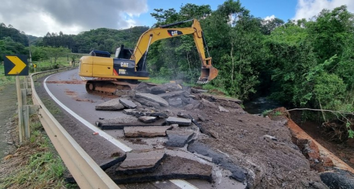 O trabalho iniciado na SC-355, no Km 151, entre Jaborá e a BR-153 – Foto: Divulgação / SIE Foram 58 ocorrências registradas em várias das 131 rodovias estaduais que cortam Santa Catarina desde a semana passada com estragos devido aos eventos climáticos dos últimos dias no estado.
