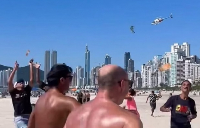 Episódio ocorreu no último domingo, 21 - Foto: Divulgação Um helicóptero provocou uma “chuva de dinheiro” na Praia Central de Balneário Camboriú na manhã do último domingo, 21 de abril. Imagens publicadas nas redes sociais mostram a aeronave em voo baixo sobre a faixa de areia e banhistas correndo para pegar as notas.