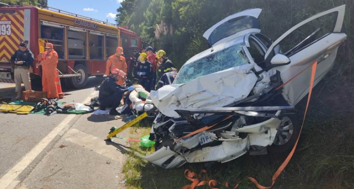 O condutor do carro sofreu lesões graves - Foto: Divulgação Uma colisão frontal às 8h10 desta manhã de terça-feira, 30 de janeiro, resultou na morte de uma senhora de 68 anos. Ela era passageira do Onix, com placas de Florianópolis, que bateu de frente contra uma carreta, com placas de Grão Pará.