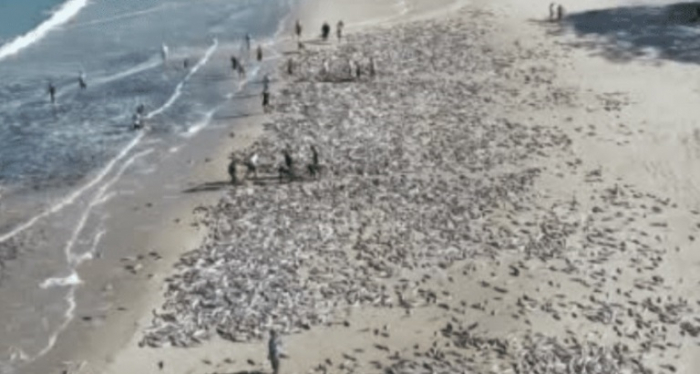 Cardume seria de 50 mil peixes - Foto: SOS Naufragado Na manhã desta segunda-feira, 26 de junho, milhares de tainhas foram capturadas em um lanço na Praia de Naufragados, no Sul Florianópolis.