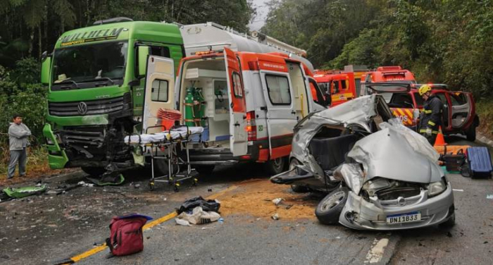 O condutor da carreta não sofreu ferimentos - Foto: Divulgação No início da manhã desta quinta-feira, 10 de agosto, o motorista de um carro após bater de frente contra uma carreta na BR-282 em Águas Mornas.