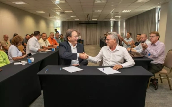 Negociação foi comandada pelo presidente da Fiesc, Mário César de Aguiar (à esq.) e o diretor da Fecesc, Ivo Castanheira – Foto: Felipe Scotti Representantes de empregadores e de trabalhadores de Santa Catarina chegaram, na última quinta-feira, 06 de março, a um consenso sobre o reajuste do piso regional para 2025.