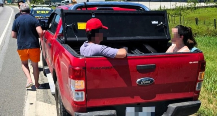 Flagrante ocorreu em Itapema na manhã desta segunda, 08 - Foto: Divulgação Policiais rodoviários federais flagraram na manhã desta segunda-feira, 08 de janeiro, na BR-101 em Itapema, uma picape placas da Argentina transportando dois passageiros no compartimento de carga.
