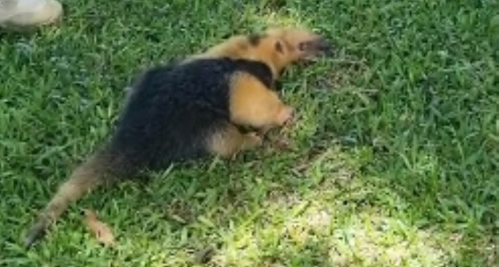 Os PRFs estavam em ronda quando testemunharam uma cena comovente: uma fêmea adulta de tamanduá-mirim, atropelada e morta às margens da rodovia e, ao lado, um pequeno tamanduá com pouco mais de 3 quilos, apenas machucado.