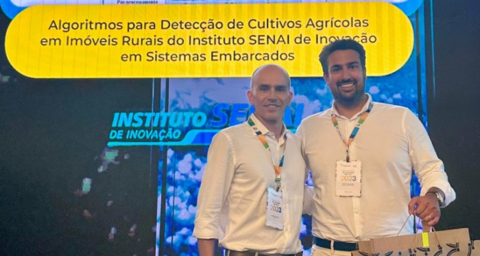 Violada (d) durante evento de premiação - Foto: Divulgação Um sistema que detecta o desenvolvimento de cultivos agrícolas em imóveis rurais, desenvolvido pelo Instituto Senai de Inovação em Sistemas Embarcados, foi selecionado como um dos três projetos mais inovadores no Prêmio de Reconhecimento de Unidades Embrapii.