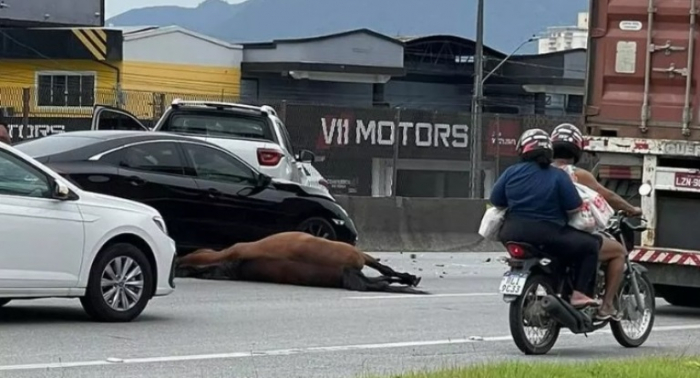 A remoção do animal é realizada com o guincho da Arteris Litoral, concessionária responsável pelo trecho, segundo informações da PRF. O acidente ocorreu próximo ao shopping Via Catarina. .