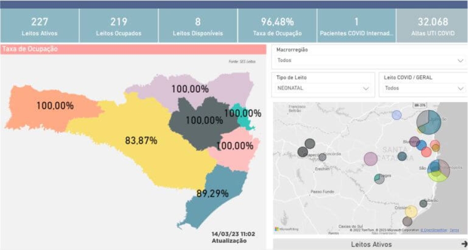 Conforme dados do painel de leitos do Estado atualizado às 11h desta manhã, as regiões do Grande Oeste, Planalto Norte e Nordeste e Foz do Rio Itajaí estão com todos os leitos de UTI neonatal ocupados.