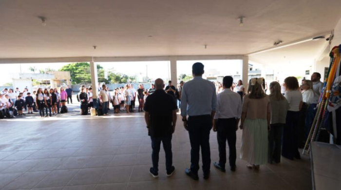 Solenidade reunião autoridades na Escola Municipal de Educação Básica Arino Bressan - Foto: Divulgação O início do ano letivo na Rede Municipal de Ensino foi marcado por um ato simbólico realizado na Escola Municipal de Educação Básica Arino Bressan, reunindo autoridades, professores e alunos em um momento de acolhimento e celebração da educação.