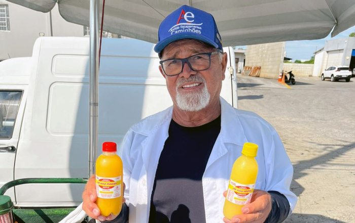 Entre os mais vendidos por Manoel estão o tradicional butiá, além de limão, maracujá e abacaxi - Foto: Fabiano Bordignon/Revista Única Faça sol ou faça chuva, quem passa pelo Posto Pegasu’s, às margens da Rodovia SC-370, em Tubarão, já se acostumou a ver uma figura conhecida: Manoel José Macedo, de 75 anos, à frente do seu ponto de venda de sucos naturais.