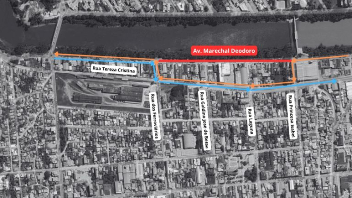 O desvio de trânsito sentido do bairro Fábio Silva para o bairro Centro, deverá ser feito por meio da Rua dos Ferroviários e, em seguida, Rua Tereza Cristina.