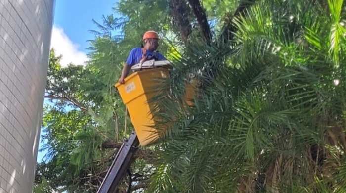 A primeira iniciativa foi a poda de quatro árvores no entorno do CMC. Os galhos das árvores que estavam muito próximas do telhado foram cortados.